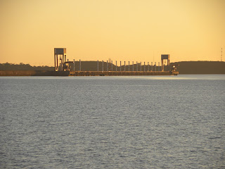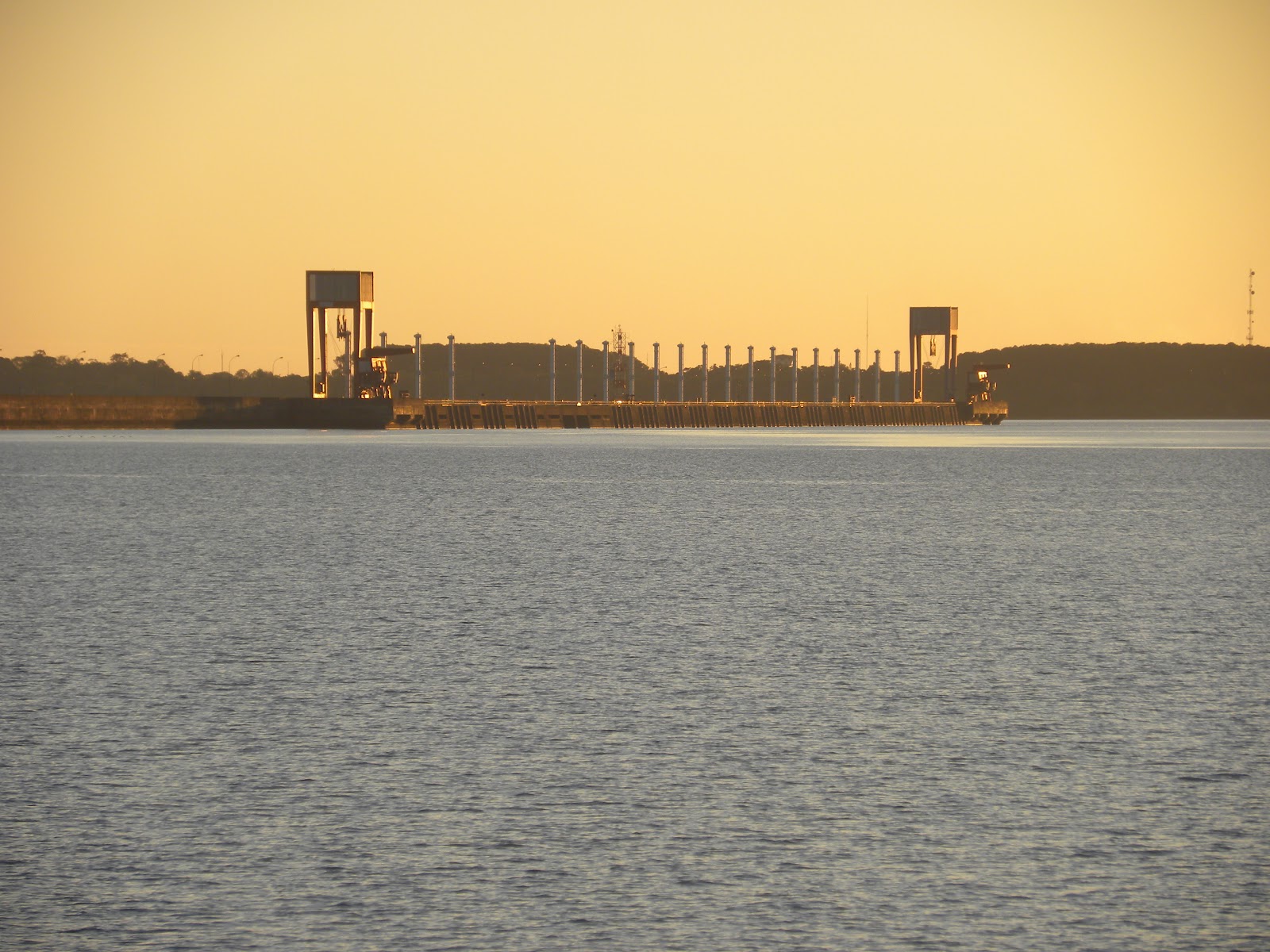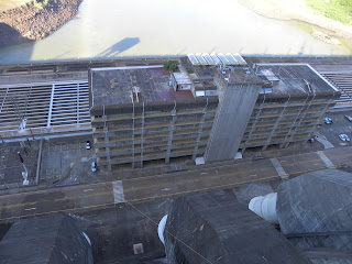 Em cima da barragem. Estes postes são a parte externa dos rotores (10 brasileiros e 10 paraguaios)