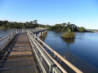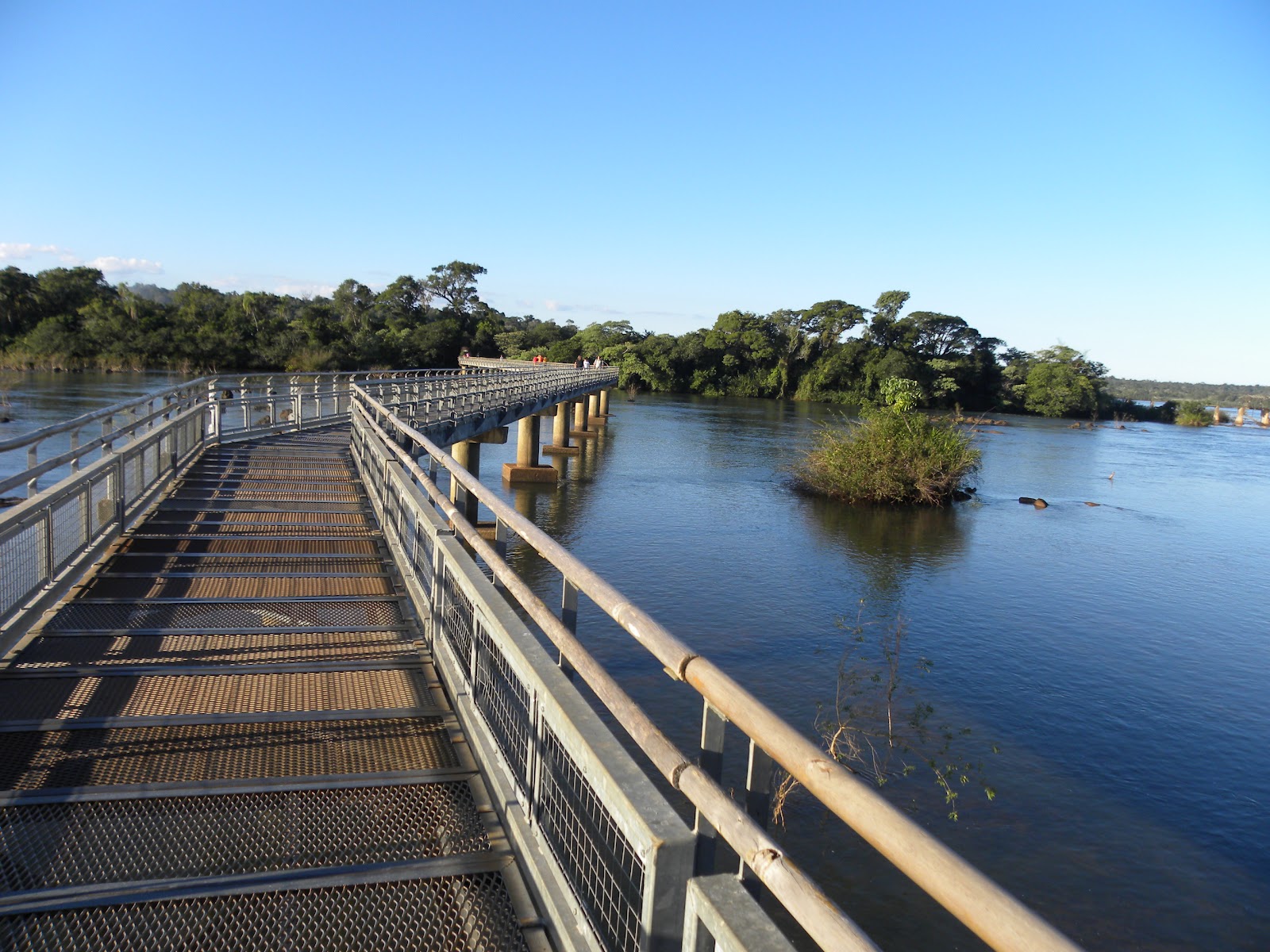 As passarelas são de metal, o corrimão de madeira. Caminhamos por cima do Rio Iguaçú