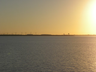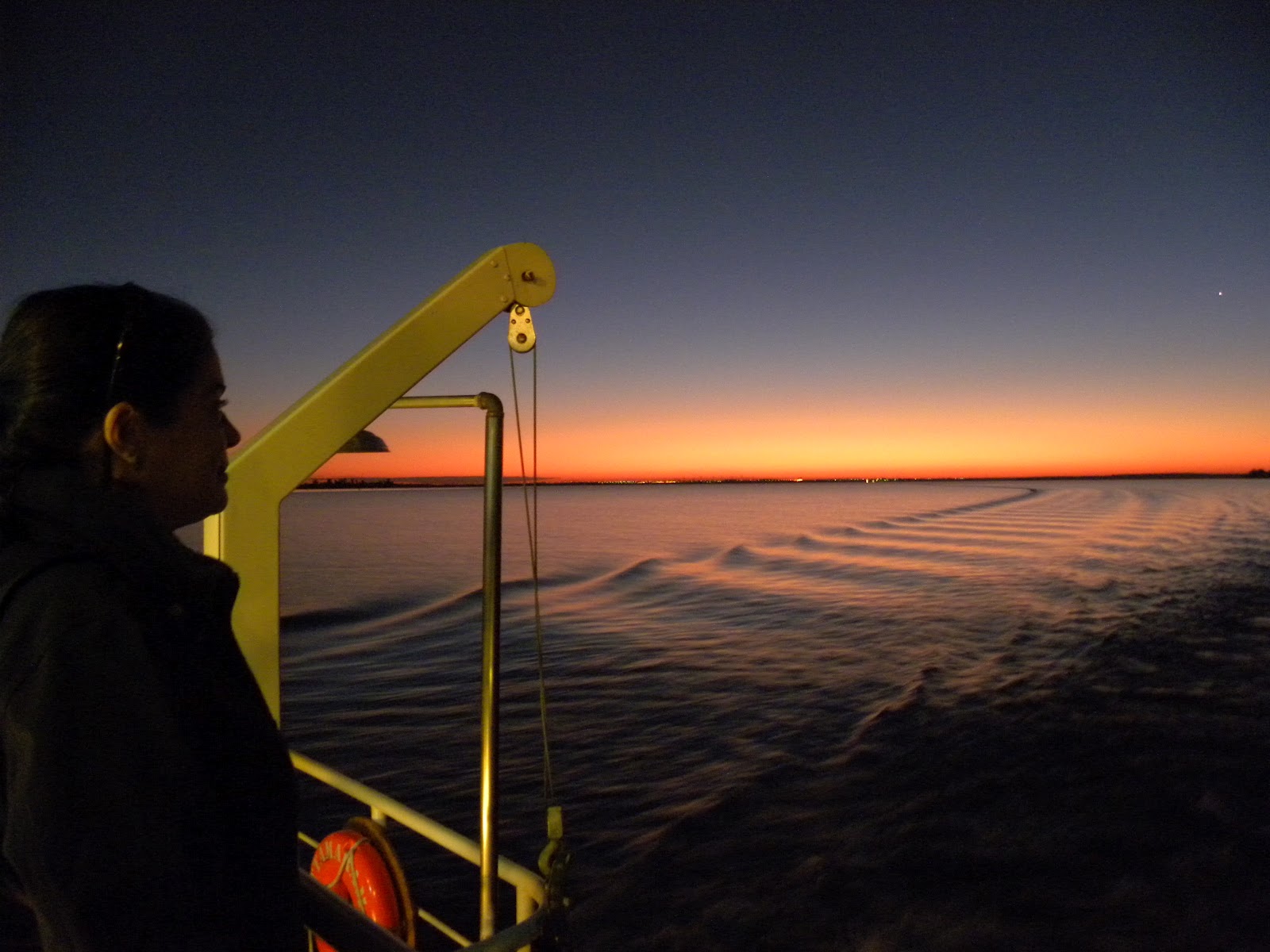 Neste dia também fomos visualizar o pôr do sol em um catamaran. Navegamos pelo lago de Itaipú. Embarcamos na Prainha e fomos até próximo à barragem da hidroelétrica.