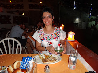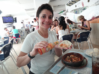 Pedimos camarões salteado no alho. O prato acompanha arroz, um potinho de maionese e tacos de farinha ou de milho. A Andréa, está quase uma mexicana legítima, fez seu taco recheado com os camarões e encheu de pimenta... Uhhhhh...