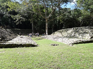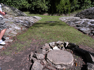 O guias nos contou que os Mayas quando faziam sacrifício, muitas vezes auto-sacrifício só o faziam após ingerirem alucinógenos, estes era obtidos a partir de uma enorme aranha. Os auto-sacrifícios eram feitos por ferfuração, no caso dos homens era no pênis, no nariz ou nas orelhas. As mulheres trespassam a língua com uma agulha e depois pelo orifício passavam uma linha cheias de espinhos, também perfuravam as orelhas ou o nariz. Utilizavam perfuradores feito com obsidiana, osso ou a agulha do cácto maguey. O sangue era queimado junto com a resina extraída do Caucho, da fumaça interpretavam a vida.