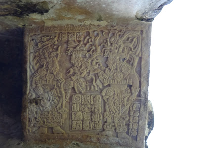 O guias nos contou que os Mayas quando faziam sacrifício, muitas vezes auto-sacrifício só o faziam após ingerirem alucinógenos, estes era obtidos a partir de uma enorme aranha. Os auto-sacrifícios eram feitos por ferfuração, no caso dos homens era no pênis, no nariz ou nas orelhas. As mulheres trespassam a língua com uma agulha e depois pelo orifício passavam uma linha cheias de espinhos, também perfuravam as orelhas ou o nariz. Utilizavam perfuradores feito com obsidiana, osso ou a agulha do cácto maguey. O sangue era queimado junto com a resina extraída do Caucho, da fumaça interpretavam a vida.